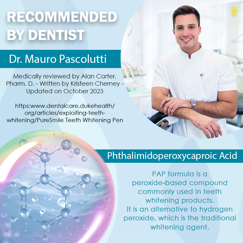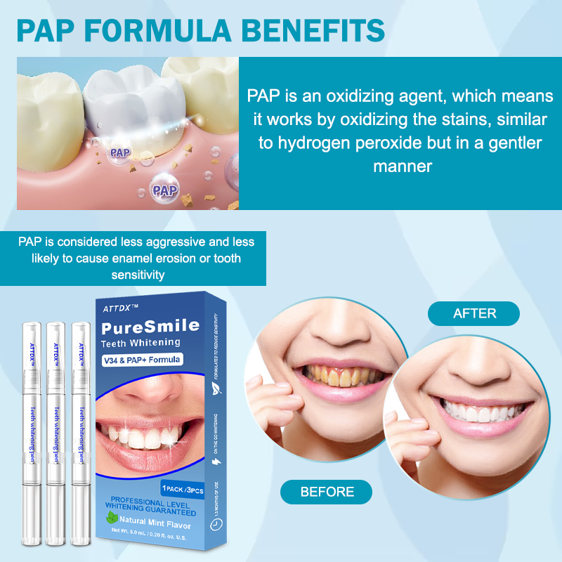 Our ATTDX™ PureSmile Teeth Whitening Pen features the innovative PAP Formula, known for its gentle yet powerful whitening capabilities. Unlike harsher agents, PAP is mild on enamel, minimizing the risk of erosion and sensitivity while effectively breaking down stains from food, drinks, and smoking. With its balanced approach to oxidation, PAP delivers noticeable results without the side effects of traditional whitening products, making it a top choice for a brighter and healthier smile.