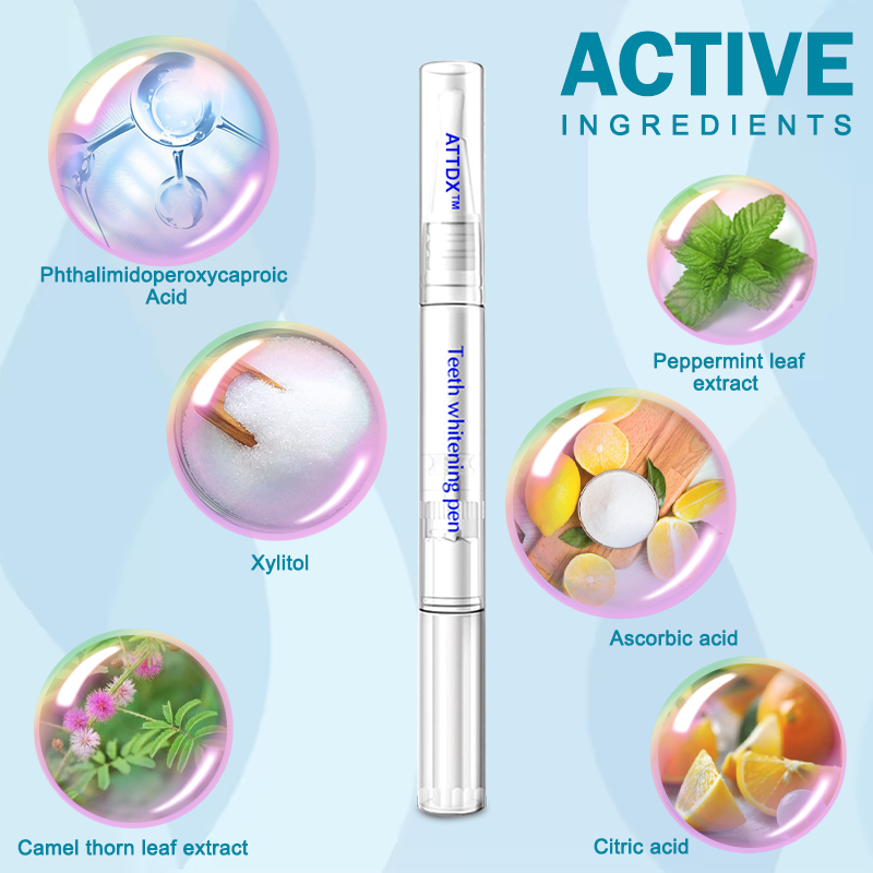 ATTDX™ PureSmile Teeth Whitening Pen features the PAP formula, or Phthalimidoperoxycaproic acid, a peroxide-based compound that effectively breaks down surface stains while being gentle on enamel. This innovative formula was studied and validated by Dr. Mauro Pascolutti at the American Dental Research Institute, with findings published in October 2023. Her study emphasized, "Our product, ATTDX™ PureSmile Teeth Whitening Pen, is designed to deliver professional-grade whitening results in a gentle, easy-to-use format. It effectively breaks down tough stains caused by food, drinks, and smoking, revealing a noticeably brighter smile. The formula is crafted to reduce the risk of sensitivity and protect your enamel, ensuring that your teeth stay healthy and strong. The pen’s precise applicator allows you to target stains with ease, making it perfect for both quick touch-ups and consistent whitening treatments. Compact and convenient, the ATTDX™ PureSmile Teeth Whitening Pen is your go-to solution for achieving a radiant smile without compromising your dental health."
