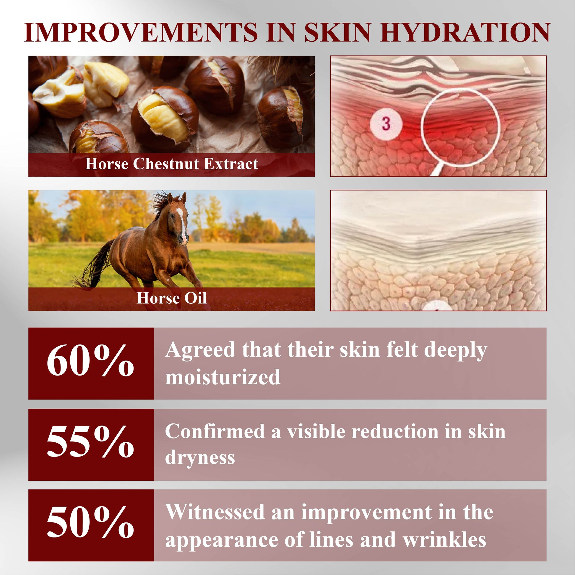 Squalene in horse oil acts as a potent moisturizer, helping restore natural oils and improve hydration. Squalene also protects the skin from oxidative stress, promoting a smoother, more resilient complexion over time.