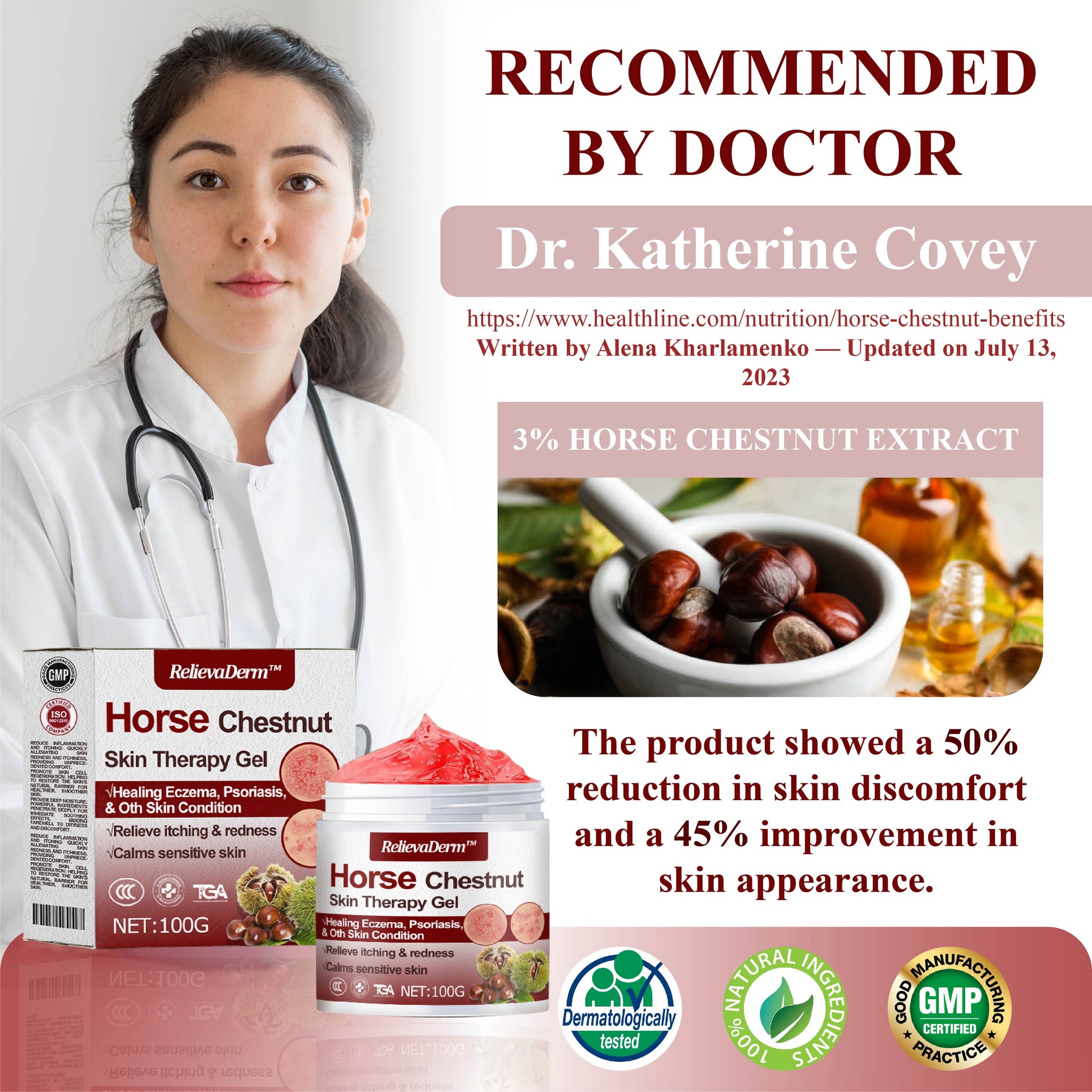 On July 7, 2024, Dr. Katherine Covey, a renowned dermatologist at the National Institute of Skin Health, conducted a study on the effectiveness of RelievaDerm™ Horse Chestnut Skin Therapy Gel. This product, containing 3% Horse Chestnut extract and 2% Horse oil, improves skin health by reducing inflammation with Horse Chestnut extract and providing deep hydration and skin regeneration through the nourishing properties of Horse oil.
