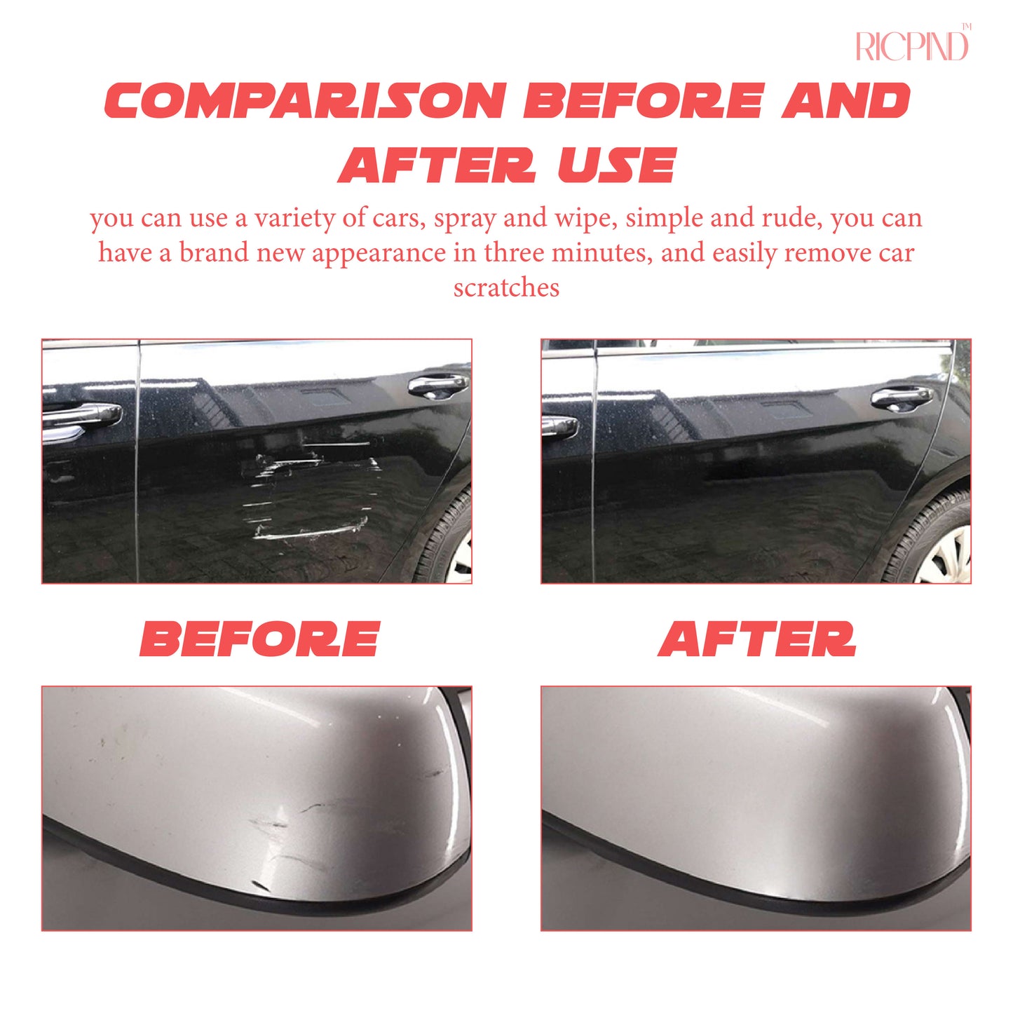 At RICPIND, we revolutionize care for your prized possessions, one scratch at a time. Grounded in our dedication to holistic product, the RICPIND ScratchMaster Car Repair Pen, equipped with liquid clear coat technology, effortlessly restores your vehicle's finish, making it look brand new. Compatible with all car makes and models, it's the ideal, user-friendly solution for tackling scratches and scuffs.
