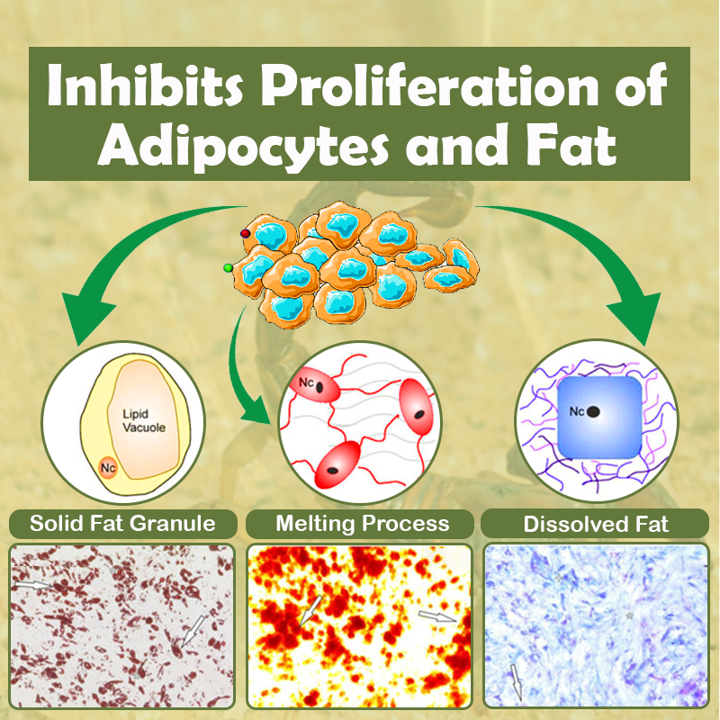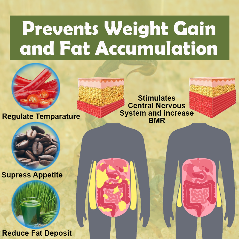 Wheatgrass extract enhances sucrose secretion and digestive juice production, improving digestion, reducing gastrointestinal discomfort, and inhibiting cell formation to prevent weight gain. Meanwhile, capsaicin activates metabolically active brown adipose tissue, increasing energy expenditure and burning, while also enhancing insulin sensitivity to regulate blood sugar levels and metabolism, thereby reducing accumulation.