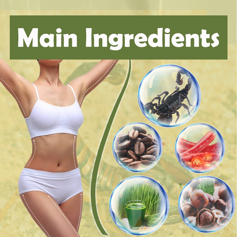 ATTDX Scorpion Venom SlimmingPatch comprises a synergistic blend of scorpion toxins, hazelnut, caffeine, wheatgrass extract, and capsaicin, each targeting key aspects of metabolic health.