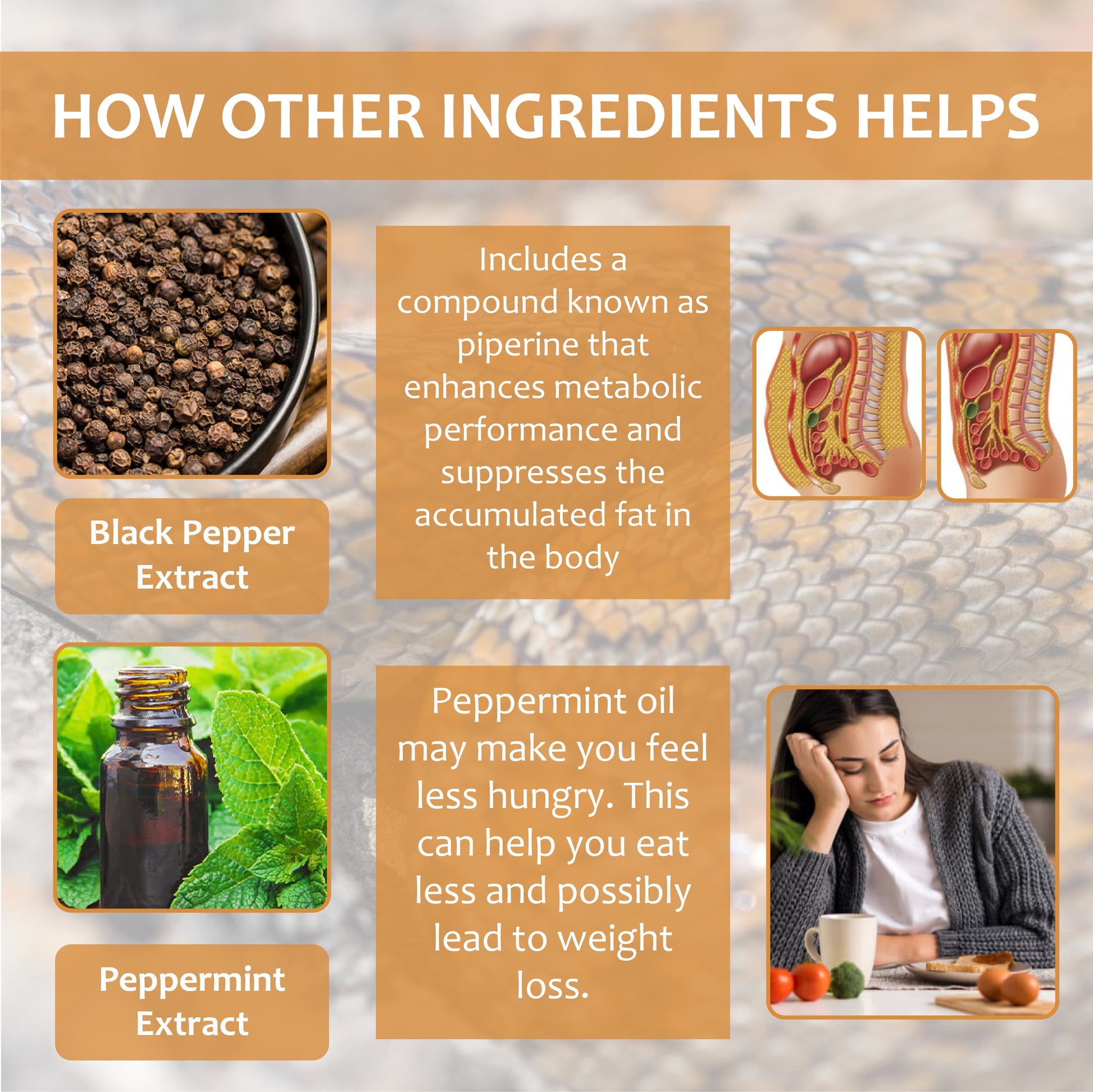Black pepper extract: Stimulates blood flow, reducing inflammation and assisting in the natural detoxification process by flushing out excess fluids and toxins.